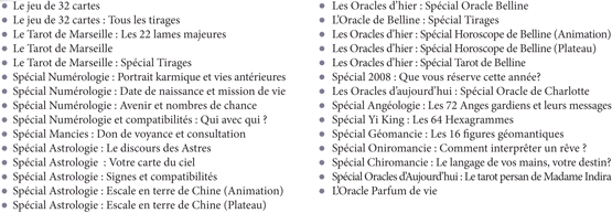 Découvrez en DVD, le jeu de 32 cartes et ses prédictions immédiates, le Tarot et ses 78 Lames, la Numérologie et ses multiples interprétations, l’Astrologie et ses douze signes, mais aussi la Chiromancie discipline qui s’intéresse aux lignes de la main.