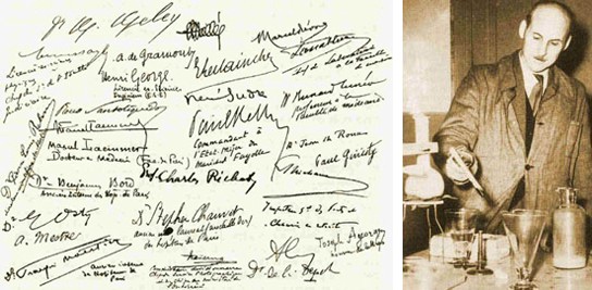 Manifeste des 34 scientifiques favorables aux médiums téléplastes (mai 1923). Le professeur Robert Tocquet ( ici dans son laboratoire) mena des expérimentations avec les médiums téléplasmiques Guzik, Kluski et Schneider