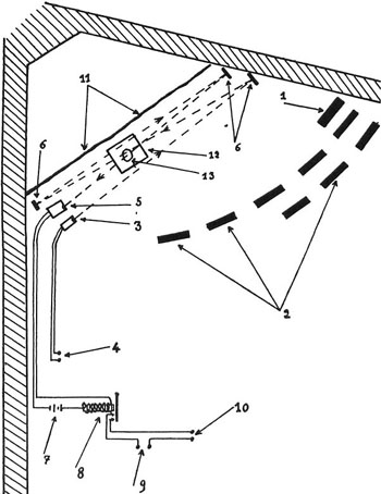 Les expériences en laboratoire du Dr Osty avec le téléplaste Rudi Schneider comprenaient des dispositifs sophisitiqués ; tels que émetteur infrarouge, photocellule à relais, déflagrateur au magnésium (notre flash actuel), des miroirs plan, etc.. Vue du dessus.