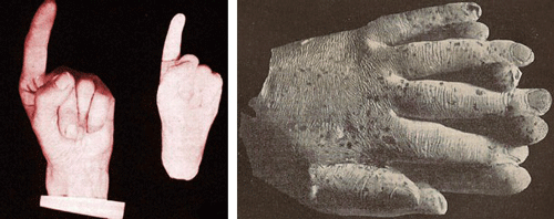 Nous citerons ici, les moulages d’idéoplasties ayant la morphologie identique à celles de mains d’adultes : rides, plis, sillons, etc., mais de la taille de celle d’un enfant !